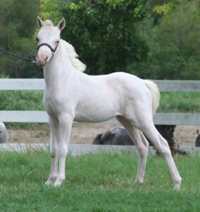 This filly is remarkably elegant and has “it” that we look for in showing, in fact, we hope she will make an excellent show mare both in halter or driving and performance in our show string She got her name partially because of her sister’s. but moreso because when the beeper went off and Armando was coming to take charge, she came out so quickly that she was already out when he arrived.